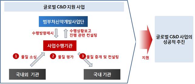 ○ 따라서 글로벌 C&D 사업의 성공적인 수행을 위하여 국내외 신약 후보 물질 소싱 및 평가, 기술 중개 활동 등 C&D 지원 사업을 운영하고 사업 전반 및 주관기관의 라이센싱 활동에 대한 컨설팅을 수행할 C&D 지원 사업이 필요함
