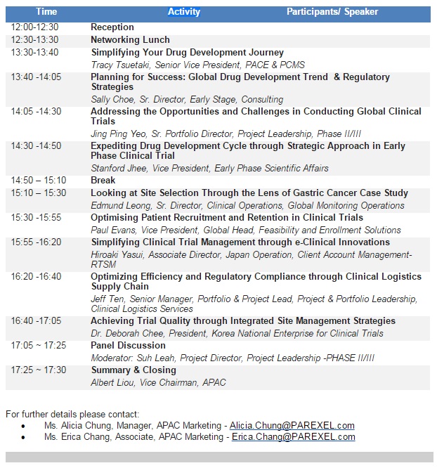 | Within the recent years, PAREXEL has witnessed the burgeoning growth of Asian biopharmaceutical companies since they have established in-house R&D capability to develop innovative new compounds. The most key aspect which Asian biopharmaceutical companies leverage from our collaboration is PAREXEL’s global expertise, resources and infrastructure that harmonized seamlessly to bring new treatment to market and to those needful patients. We believe the world would be a healthier place if the journey between science and new treatments will be simpler. Please join us as we invite drug development and regulatory subject matter experts from all around the world to deliberate upon the challenges and opportunities of the contemporary global drug development. |