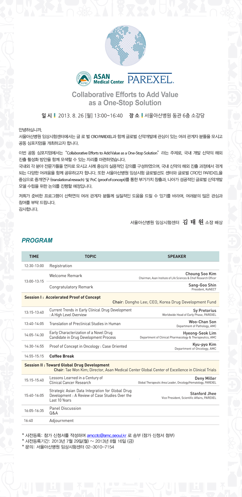 서울아산병원 임상상시험센터에서는 글로벌 CRO PAREXEL과 함께 글로벌 신약개발에 관심이 있는 여러 관계자 분들을 모시고 공동 심포지엄을 개최하고자 합니다.