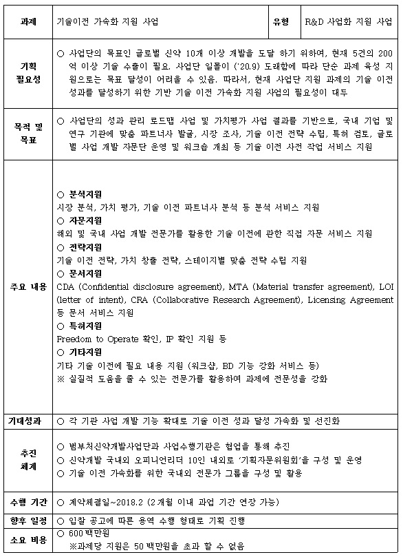 ○ (사 업 명) 2017년 범부처신약개발사업단 기술이전 가속화 지원 사업