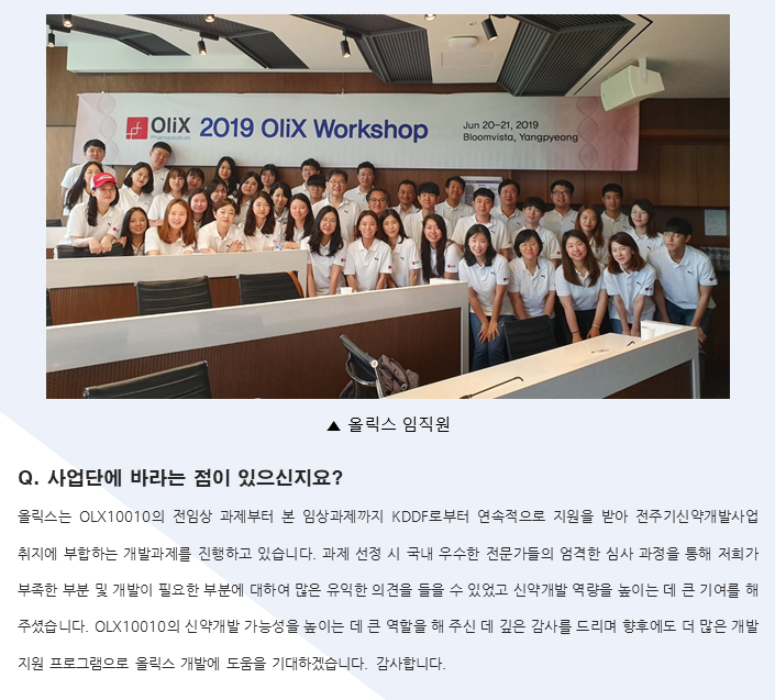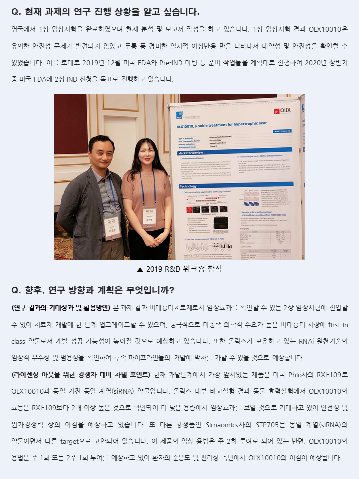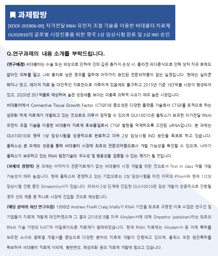 [올릭스] 자가전달 RNAi 유전자 조절 기술을 이용한 비대흉터 치료제 OLX10010의 글로벌 시장진출을 위한 영국 1상 임상시험 완료 및 2상 IND 승인