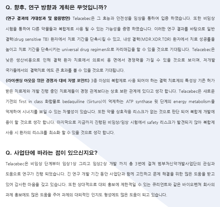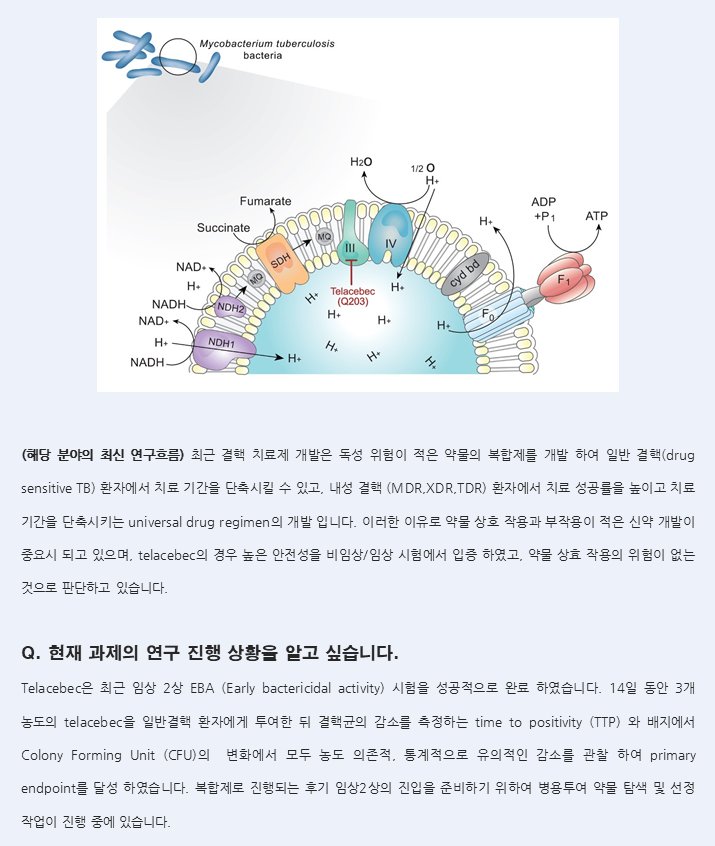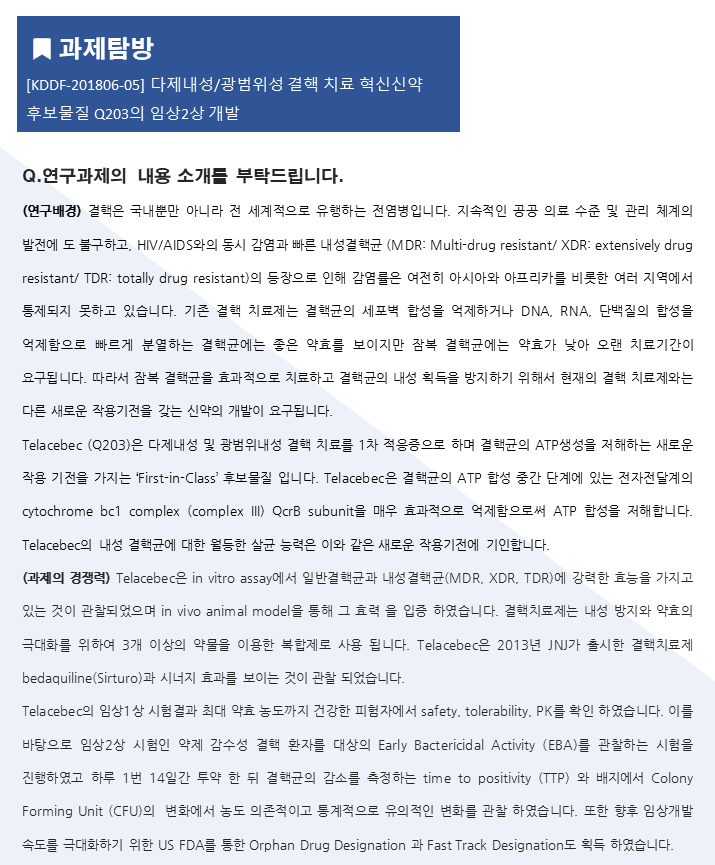 [큐리언트] 다제내성/광범위성 결핵 치료 혁신신약 후보물질 Q203의 임상2상 개발