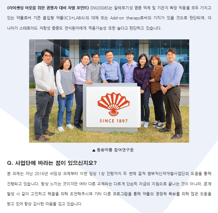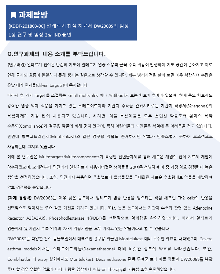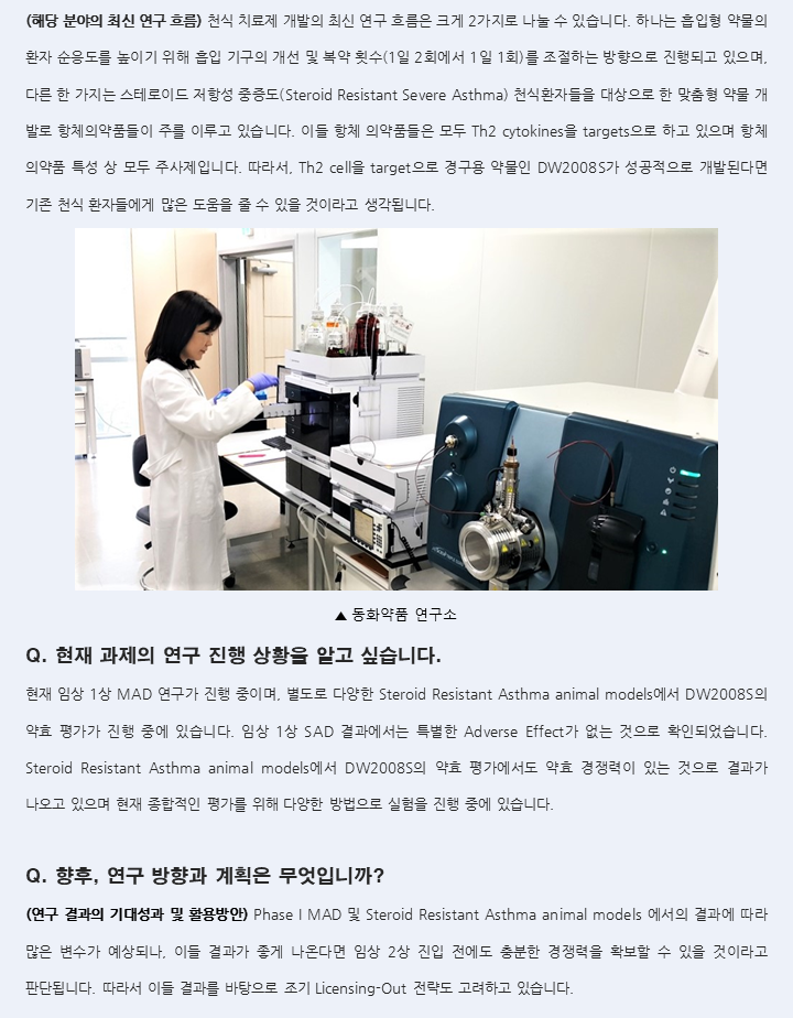 [동화약품] 알레르기 천식 치료제 DW2008S의 임상 1상 연구 및 임상 2상 IND 승인
