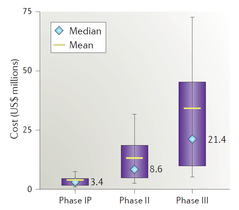 3.    Mullard A. Nat Rev Drug Discov. 2018 Oct 30;17(11):777. How much do phase III trials cost?