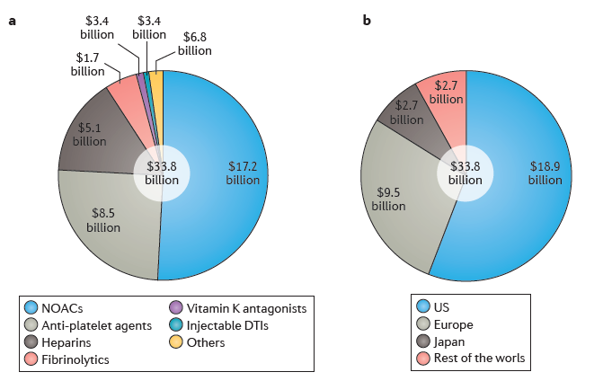 2017년, 항혈전제 시장은 US$33.8B로 보고 되었다. 이는 2016년도 대비 14% 증가한 수치이다. 항혈전제 시장에서 대부분은 NOAC 계열이 차지하고 있으며 그 비중은 51%에 육박한다. 2017년, 전체 Antithrombic agents 시장의 56%를 차지하는 미국 시장에서 Ribaroxaban $7.6B (40%), Apixaban $6.9B (36%), Dabigatran $2.0B (11%), Edoxaban $571M (3%)을 나타냈다. 이는 NOAC이 미국 전체 시장의 90%를 차지함을 나타낸다. 미국에서 Apixaban 매출은 2016년대비 2017년에서 53%가 증가했으며 Ribaroxaban 은 19% 증가했다. Warfarin의 한달 공급가는 약 $20로 약 $350 들어가는 NOAC보다 매우 저렴 (17.5배)하기 때문에 단순 매출보다 처방건수는 적음을 알 수 있다.
