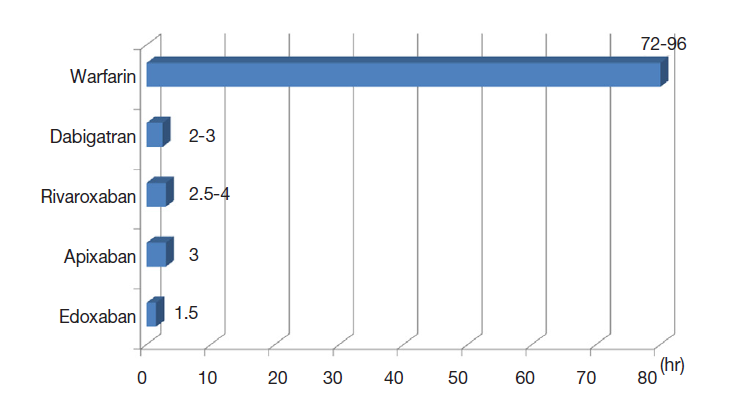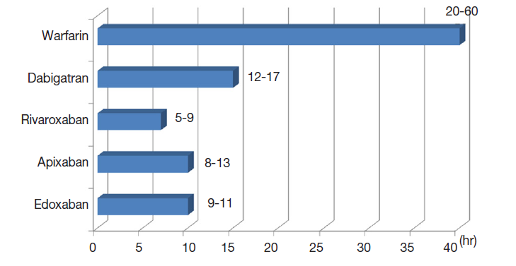 와파린의 긴 반감기는 수술 전 복용을 중지하고 프로트롬빈 시간을 측정해야 하는 불편함을 야기했다. 하지만 NOAC은 짧은 반감기는 이러한 불편한 점을 해결했다.
