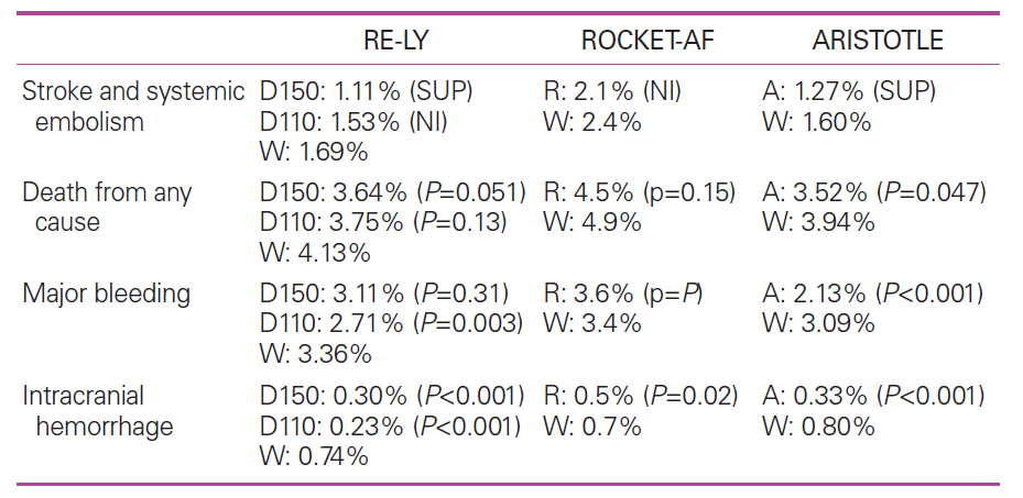 D150/D110, dabigatran 150 mg/110 mg group; SUP, superior; NI, non-inferior; W, warfarin group; R, rivaroxaban group; A, apixaban group.