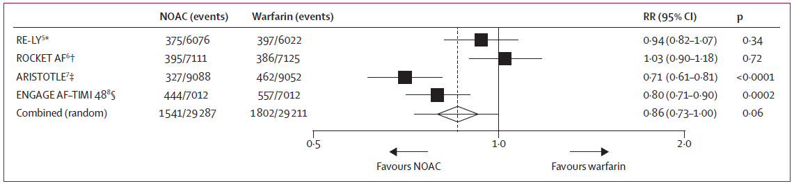 Data are n/N, unless otherwise indicated. Heterogeneity: I²=83%; p=0·001. NOAC=new oral anticoagulant. RR=risk ratio.