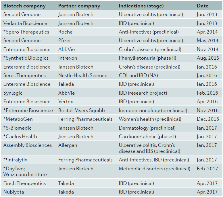 J&J, Pifzer, Mayo Clinic, King’s College 등과의 협력체계를 구축한 Second Genome는 과민성대장증후군 환자의 염증과 통증 치료를 위한 미생물 매개 표적의 화합물을 개발하여 임상 2상 연구를 진행하고 있으며, Enterome은 부작용을 일으키는 박테리아의 효소를 제거하거나 억제하는 방식으로 크론병과 C. difficile 감염증을 타겟한 저분자 화합물을 개발하고 있다.