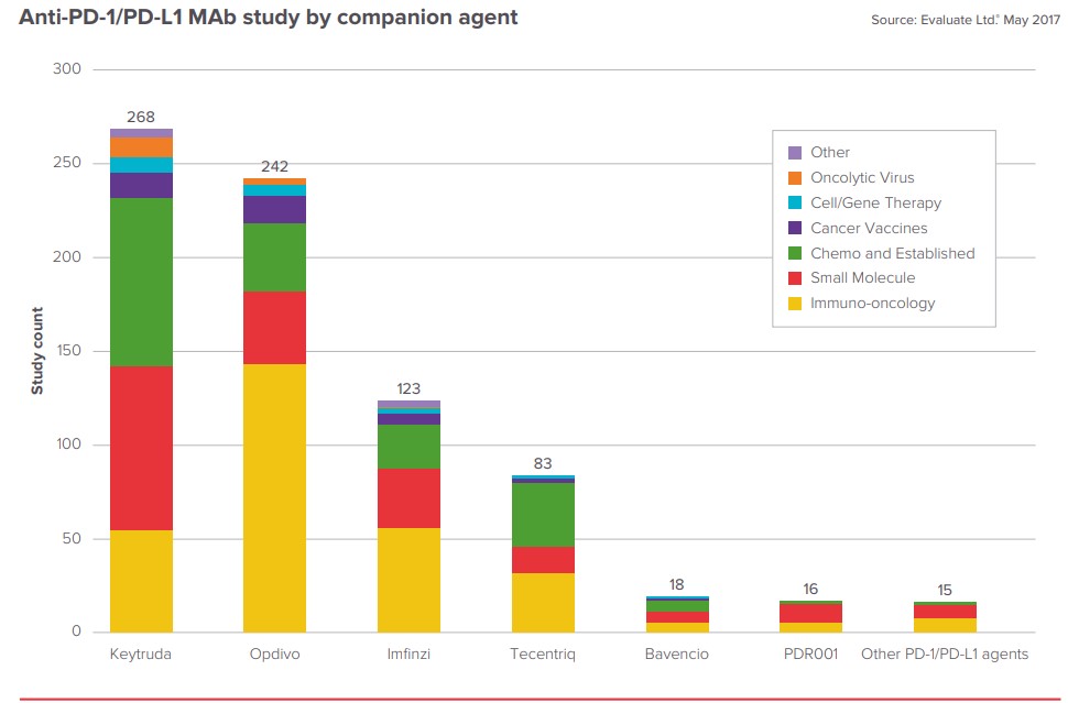 하지만, 뛰어난 효과의 면역항암제가 넘어야 산들은 아직 남았다. 일부 암종을 제외한 Overall response rate (ORR) 20%~30% 불가하기 때문이다. 따라서, 면역항암제를 통한 항암 치료율을 높이기 위한 여러 접근법이 시도되고 있다. 새로운 타겟 발굴 (LAG3, B7-H3, B7-H4, TIM3, OX40 ) 기존의 면역관문억제제와의 병용 연구가 예이다. 특히 병용 요법에 대한 연구가 매우 활발하다. 2017 5 기준, Clinicaltrials.gov 등록된 anti-PD-1, anti-PD-L1 병용 연구는 765건이 진행되고 있다. Keytruda (MSD) 병용요법은 268건이고, Opdivo (BMS) 242건에 다다른다. (Figure 1)