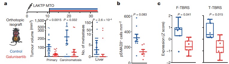 Tauriello Invasive tumor 에서 T-cell infiltration 되지 않았으며, 종양 margin에서 높은 stromal TGFβ 발현을 확인했다. Mouse tumor organoids (MTO) mice 이식 , TGFβ receptor type 1 specific inhibitor (Eli-lilly, Galunisertib) 투여시, 종양의 크기와 섬유아세포에 대한 TGFβ 반응은 줄어들고 (F-TBRS, TGFβ response signatures in fibroblasts), T-cell infiltration 증가가 관찰되었다. (Figure 2)