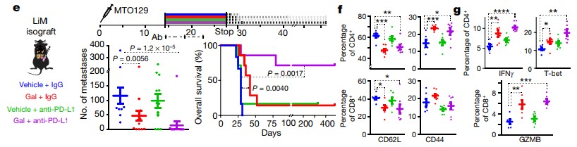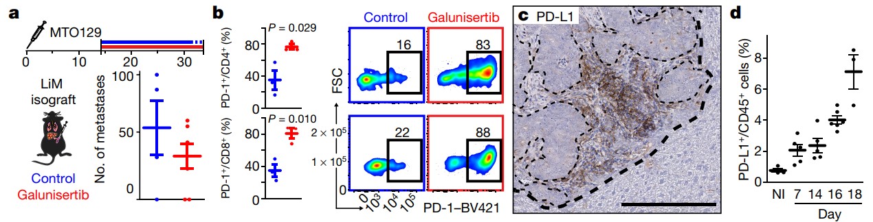 Galunisertib PD-L1 항체의 병용 투여는 이러한 mild 효과를 개선할 있다. Galunisertib PD-L1항체 병용 투여결과, 단독투여군 보다 IFNγ CTL Granzyme B (GZMB) 수치가 증가하였다. IFNγ M1 macrophage 활성화 시켜 Tumor suppression 효과 보이게 된다. GZMB apoptosis 유도한다. 또한, 투여 중단 관찰결과 1년이 넘는 Overall survival 관찰되었다. (Figure 4)