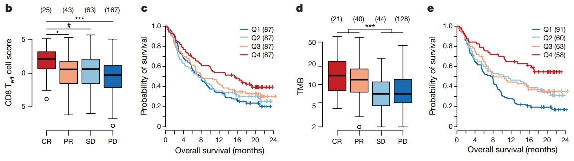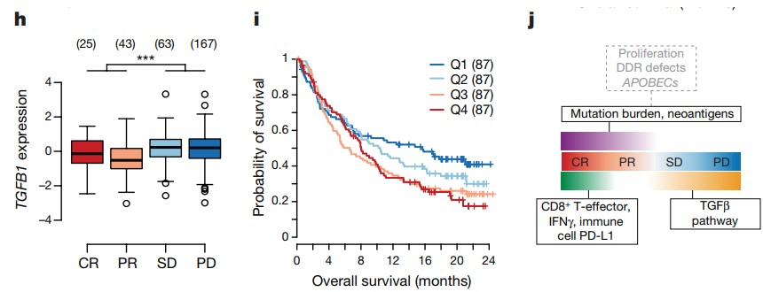 Mariathasan 논문은 Anti-PD-L1 (atezolizumab) 투여 UrC 환자 코호트 연구를 통해 anti-PD-L1 responder Non-responder 환자의 biomarker 분석 하였다. Anti-PD-L1 약물 반응군은 CD8+ Teff cells 관련 유전자의 높은 발현율과 높은 종양 변이부담 (Tumor Mutational Burden) 가지며, 약물 미반응군의 TGFβ signaling pathway 관련 유전자 발현을 확인했다. (Figure 5)