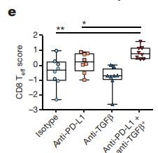 Anti-PD-L1 anti-TGFβ 투여군에서 Infiltrating T cells 유의하게 증가했으며 (CD8 Teff score), RNA-sequencing data에서는 CD8+Teff signature 증가를 보여줬다. (Figure 7)