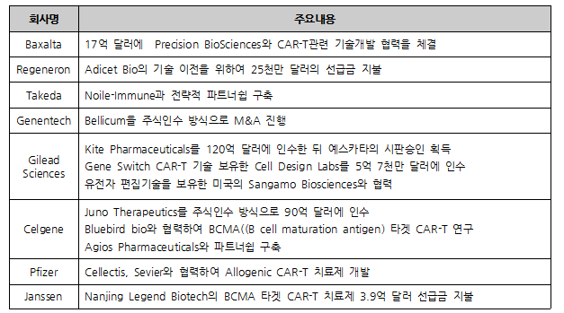 2007년 3개, 2014년 30여개에 불과하였던 CAR-T의 임상 파이프라인은 2017년 1월 기준 373개로 급증하였으며, 이러한 흐름을 반영하여 Baxalta, Genentech, Takeda, Pfizer 등 빅파마들도 기술거래 및 M&A등을 통하여 CAR-T 개발에 박차를 가하고 있다. (표 1)