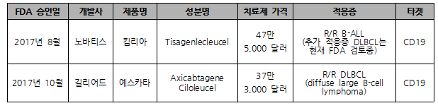 2017년은 항암제 개발에 있어서 가장 주목할 만한 한해였다. 재발/불응성 B세포 급성 림프구성 백혈병 CR(Complete Remission) 80%란 놀라운 효능을 보인 CAR-T 치료제가 2017년 9월 FDA에서 최초로 승인됨에 따라 혈액암 치료제의 새로운 패러다임을 제시하였기 때문이다.