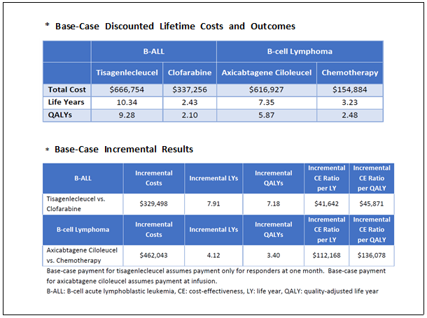 영국의 의료기술평가기관인 NICE(National Institute for Health and Care Excellence)에서는 1QALY(Quality Adjusted Life Years)당 3만파운드(약 4만 3천달러)를 넘으면 경제성이 없다고 판단하고 있는데, 2018년 ICER(Institute for Clinical Economic Review)에서는 킴리아와 예스카타의 1QALY 당 비용을 베이스 시나리오 기준, 각각 4만 6천달러와 13만 6천달러로 평가하고 있다. (표 3)