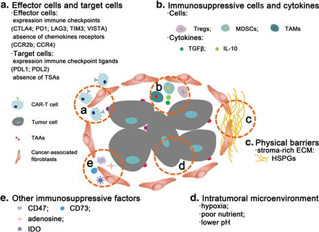 두 번째는 Microenvironment로 인한 어려움이다. 고형암에서 분비되는 사이토카인과 주변 세포의 영향으로 Immunosuppressive한 환경이 조성되는데 이는 T 세포의 활성을 저해하는 주요 원인으로 작용하고 있다. CAR-T가 효능을 잘 발휘하기 위해서는 타겟하는 리셉터로 잘 이동하여 활성화되어야 되는데 암세포는 CXCL9, CXCL10 등의 발현하여 CAR-T가 암세포로 이동하는 것을 방어한다. 또한 T 세포의 활성을 직간접적으로 저해하기 위해서 TGF-β나 IL-10 등 면역반응을 억제하는 사이토카인을 분비하는 것은 물론 Treg, MDSCs 등 면역반응을 억제하는 세포들에게 시그널을 전달함으로써 면역시스템으로부터 자신을 보호한다. 이러한 면역억제 종양 미세환경 외에도 고형암 치료제로서 CAR-T가 효과를 발휘하기 위해서는 이미 잘 알려진대로 T 세포가 암세포 자신을 공격대상으로 인지하지 못하도록 면역회피인자(Immune Check Point)에 의한 암 세포의 방어기작을 넘어서야만 한다.