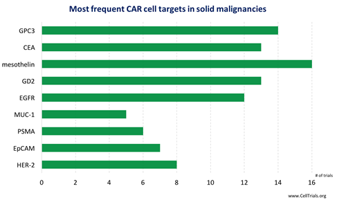 이러한 문제점들을 해결하기 위하여 TGF-β, IL-2, IL-10 PD-1 negative receptor를 타겟하는 CAR-T를 개발하거나 IL-12와 같이 면역세포 기능 활성화 역할을 하는 사이토카인 발현 유전자를 삽입하는 방식으로 개발되고 있으며, 상업 임상은 5개의 중국 바이오기업을 중심으로, 연구자 임상은 미국의 주요 병원을 중심으로 진행되고 있다. 그림2는 고형암으로임상이 진행되고 있는 주요 타겟 현황이다.