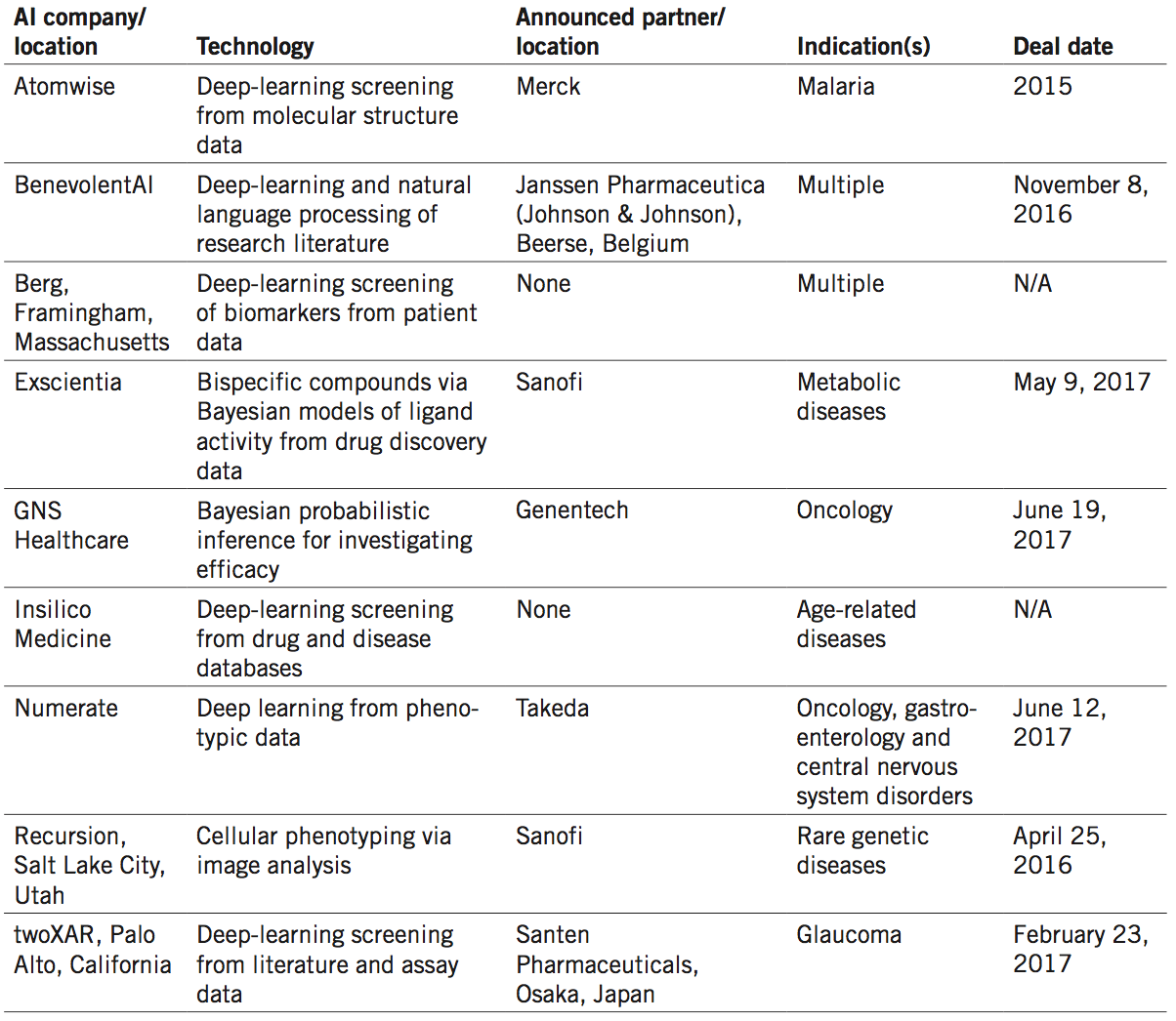 제약 산업 부문에서도 인공지능과 기계학습은 눈에 띄는 키워드가 되고 있다. 특히 GSK, AstraZeneca, Sanofi 등의 대형 제약회사들은 Excientia, Numerate, Berg 등의 인공지능 기술 기반의 바이오텍들(이하 AI pharma)과 상당한 규모의 마일스톤 계약들을 만들어내면서 적극적으로 인공지능 기술의 가능성에 기대를 걸고 있다. Nature Biotechnology 저널에서는 이러한 분위기를 발 빠르게 이슈화하여 “AI-powered drug discovery captures pharma interest”라는 특집 기사를 내기도 하였다. 뿐만 아니라 AI Pharma innovation summit 과 같은 AI pharma들과 전통 제약회사들이 모이는 국제회의들이 미국과 유럽을 중심으로 잇따라 생겨나면서 제약 산업에서의 인공지능 기술 활용에 대한 관심을 반영하고 있으며, 이러한 분위기는 당분간 지속될 전망이다.