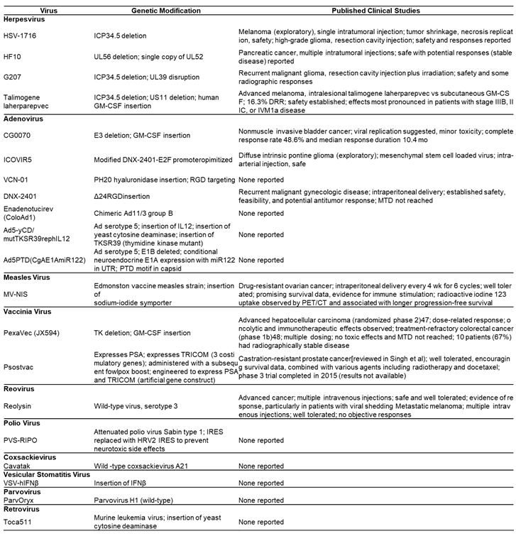 다양한 종류의 바이러스가 항암치료제로써의 가능성으로 임상 연구가 진행 되었다. 그 중 Herpesvirus, Adenovirus, Vaccinia Virus, Measles Virus, Coxsackievirus, Polio Virus, Retrovirus, Reovirus, Parvovirus H1, Vesicular Stomatitis Virus, Newcastle Disease Virus가 보고되었으며 바이러스 유전자 부위의 조작(modification), 삽입(insertion), 결손된(deletion) 부위의 특징과 보고된 임상시험 결과는 다음과 같다<테이블4>.