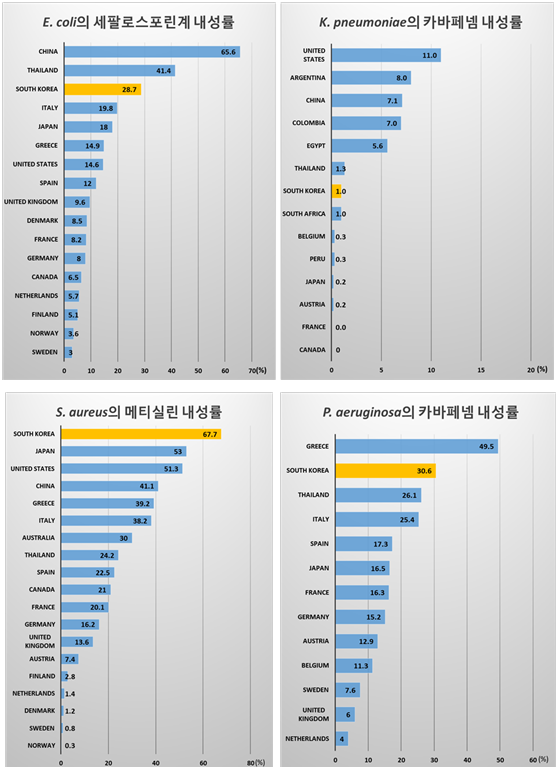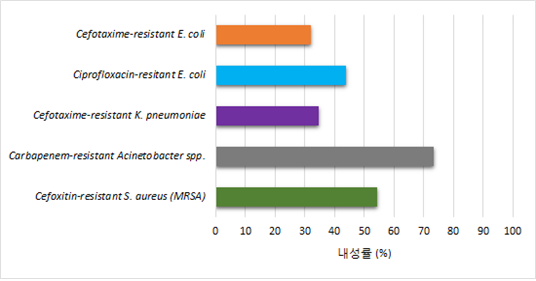 그런데 2017년 4월 5일자 JTBC(http://news.jtbc.joins.com/article/article.aspx?news_id=NB11449973) 등 여러 보도자료에 의하면 국내에서 젖소 원유에서 황색포도상구균의 슈퍼박테리아가 검출되었는데 문제는 감염경로 조차 파악이 안되는 사태가 발생한 것이다. 또한 2017년 7월 5일 보건복지부 보도자료에 의해 다시 한번 더 우리나라의 항생제 내성균의 심각성을 적나라하게 알 수 있게 되었다(2017년 7월 5일 보도자료, 그림 4). 질병관리본부/ 국립보건연구원은 GLASS에서 요청하는 표준화된 자료를 산출하기 위해 6개 권역(서울, 경기, 강원, 충북, 전남, 부산)의 종합병원을 감시기관으로 지정하여 환자로부터 분리된 8종의 감시 대상 병원체(대장균(Escherichia coli), 폐렴막대균(Klebsiella pneumoniae), 아시네토박터균(Acinetobacter spp.), 황색포도상구균(Staphylococcus aureus), 폐렴알균(Streptococcus pneumoniae), 살모넬라균(Salmonella spp.), 세균성이질균(Shigella spp.), 임균(Neisseria Gonorrhoeae)병원체에 대한 항생제감수성 검사와 내성유전자 특성 조사 등 실험실감시를 ’16년 5월부터 수행한 결과 총 10,586주(균체 단위)를 수집, 분석하였다. 주요 병원체의 내성률(그림 4)을 보면 대장균의 43.9%가 ciprofloxacin, 32.1%가 cefotaxime에 내성이었으며 폐렴막대균의 34.5%가 cefotaxime에 내성이었다. 또한 아시네토박터균의 경우 73.4%가 carbapenem에 내성이었고, 황색포도상구균의 54.3%가 MRSA(메티실린 내성 황색포도상구균)로 확인하였다.