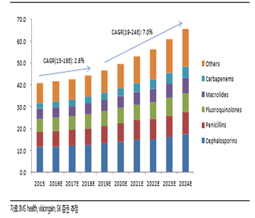IMS Health 등에 의하면 항생제 세계 시장 규모는 2017년 40.0 b$ 이상일 것으로 예상하였으며 2018년 이후 연평균 7.0% 성장률로 2024년 60.0 b$에 이를 것으로 전망되고 있다(노경철의 ‘빅파마가 다시 뛰어드는 항생제 시장’에서 인용) (그림 5).