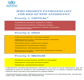 이에 의하면 신규 항생제 개발이 요구되는 심각, 상위 위험, 중위 위험 군의 세 군으로 나누어 대응 방안 모색을 제시하였다. 이와 동시에 지속적으로 신규 항생제에 대한 내성균이 발생할 우려가 크므로 이에 대한 다른 비 항생제 적 치료제 등 치료 방안 모색도 권고하고 있다(WHO priority pathogens list for R&D of new antibiotics; Priority 1: CRITICAL; 1.Acinetobacter baumannii, carbapenem-resistant, 2.Pseudomonas aeruginosa, carbapenem-resistant, 3.Enterobacteriaceae, carbapenem-resistant, ESBL-producing; Priority 2: HIGH, 1.Enterococcus faecium, vancomycin-resistant; 2.Staphylococcus aureus, methicillin-resistant, vancomycin-intermediate and resistant, 3.Helicobacter pylori, clarithromycin-resistant, 4.Campylobacter spp., fluoroquinolone-resistant, 5.Salmonellae, fluoroquinolone-resistant, 6.Neisseria gonorrhoeae, cephalosporin-resistant, fluoroquinolone-resistant, Priority 3: MEDIUM, 1.Streptococcus pneumoniae, penicillin-non-susceptible, 2.Haemophilus influenzae, ampicillin-resistant, 3.Shigella spp., fluoroquinolone-resistant)