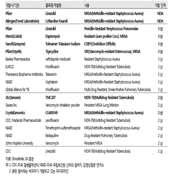 항생제의 국내외 개발동향은, 2016년(6월) 발간된 ‘빅파마가 다시 뛰어드는 항생제 시장, 노경철 저’를 참조하면 좋을 것이다(13). 동 자료는 관련 동향에 대해서 광대한 자료를 확보, 제시하고 있다, 동 자료에 의거하면 일반항생제 개발은 임상 2상 이상에 진입되어 있는 건만 하여도 그람양성균 35건 그리고 그람음성균 20건이 있다. 그리고 항생제 슈퍼내성균에 대한 개발 건만 하여도 2016년 보고 당시 아래 표 1, 2에 제시되어 있는 바와 같이 미국 FDA의 NDA에 들어가 있는 것만 하여도 3개, 그리고 IND이상은 그람양성균 19건 그리고 그람음성군 3건 이상이 진행되고 있다. 국내 제조사로서는 유일하게 크리스탈지노믹스의 Gram Positive 슈퍼항생제(CG400549, FDA 2 상 a 완료)가 포함된 것으로 보고된 바 있다. 더 자세한 국제 및 국내 항생제 개발 동향은 노경철의 ‘빅파마가 다시 뛰어드는 항생제 시장’ 원문과 아래 표 1, 2를 참고하면 도움이 될 것이다(16).http://medipana.com/news/news_viewer.asp?NewsNum=205366&MainKind=A&NewsKind=5&vCount=12&vKind=1