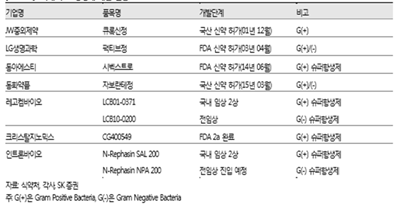 우리나라의 항생제 개발 현황을 보면, 국내산 신약이 4 건 출시되었고 그 중에 FDA 신약으로 허가 받은 의약품이 2개 있다. 현재 개발 중인 주요 신약 후보로는 레고켐바이오의 Gram Positive 슈퍼항생제(LCB01-0371, 국내 임상 2상), 크리스탈지노믹스의 Gram Positive 슈퍼항생제(CG400549, FDA 2 상 a 완료), 인트론바이오의 Gram Positive 슈퍼항생제(N-Rephasin SAL 200, 국내 임상 2상) 등이 있다. 레고켐바이오 의 LCB01-0371 는 경쟁 약물 대비 안정성을 크게 끌어올린 Best-in-Class 품목이고, 크리스탈지노믹스의 CG400549, 인트론바이오의 N-Rephasin SAL 200은 기존에 없던 혁신적인 치료제 방식의 First-in-Class 약물이다. 이외에 레고켐바이오와 인트론바이오는 강력한 Gram negative 슈퍼항생제를 전임상 중에 개발하고 있다. (빅파마가 다시 뛰어드는 항생제 시장, 2016, 노경철, SK 증권사).