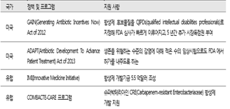 즉 다국적기업들과 미국 등 선진국은 '슈퍼박테리아'를 이기기 위한 항생제 개발을 도전적으로 진행하고 있음을 알 수 있다. 특히 미국의 경우 항생제 내성으로 인한 위기를 해결하기 위해 2012년부터 항생제를 개발하면 신속 허가와 시장독점권과 같은 인센티브를 제공하고 하는 '항생제 개발 촉진법(GAIN Act)'을 시행하고 있다. 지금까지 미국에서 새로 개발돼 감염질환인증제품(QIDP, Qualified Infectious Disease Product)으로 출시된 항생제가 5개 이상이다. http://cddep.org/blog/posts/recent_fda_antibiotic_approvals_good_news_and_bad_news#sthash.uVHOmWym.dpbs 미국 외에도 선진국들은 항생제 내성균 대응을 위한 적극적인 정책이 이미 수년간 진행해 오고 있다(표4). 그러나 우리나라는 아직 선진국처럼 적극적인 개발 지원책이 체계적으로 수행되고 있지 않다. 더욱이 미국 등에서 개발된 제품조차 아직 국내에서 적절히 시판 및 사용되고 있지 않아서 사용이 아직 제한적인 상황이라고 한다(표4) 슈퍼박테리아' 이기는 新항생제, 한국서는 그림의 떡?, 메디파나뉴스, 박으뜸, 2017-08-14) (http://medipana.com/news/news_viewer.asp?NewsNum=205366&MainKind=A&NewsKind=5&vCount=12&vKind=1)(16)