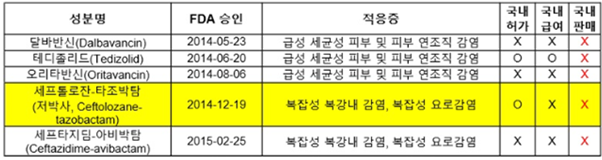 (표 5) 미국에서 2012년 항생제 개발 촉진법 시행 이후 승인 받은 항생제와 국내 허가 및 판매 여부, 메디파나뉴스, 박으뜸, 2018, 8.14.