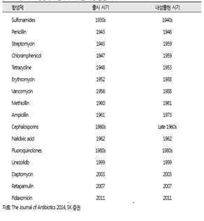 (표 6) 주요 항생제의 내성 출현 시기의 비교