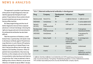 22. News and Analysis: Antibacterial antibodies gain traction First pivotal study win for Merck &Co.’s antibacterial antibody suggests that biologics could at last bring precision medicine to the anti-infective space, Nature Reviews, V14, Nov.(737 ~8), 2015.