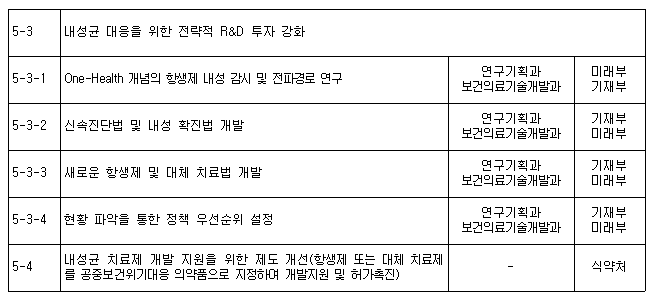 그러나 아직 항생제 내성균에 대해 필요한 대응 조처가 더 신속하게 진행되어야 할 것으로 생각된다. 특히 국가 항생제 내성 관리대책(2016~2020) 추진 과제 중 R&D 분야(표 7)에서 내성균 대응을 위한 전략적 R&D 투자 강화 분야 중 내성균 치료제 개발 지원을 위한 제도 개선(항생제 또는 대체 치료제를 공중보건위기대응 의약품으로 지정하여 개발지원 및 허가촉진)에 있어서도 미국의 경우에서 보았듯이 본고에서 논의한 항체치료제 등도 포함하여 신규 항생제 뿐만 아니라 항체치료제의 신속한 개발 및 허가로 이어질 수 있도록 위기대응 및 산업 발전의 두 마리 토끼를 잡을 수 있는 선제적 제도가 마련되기를 기대해 본다.