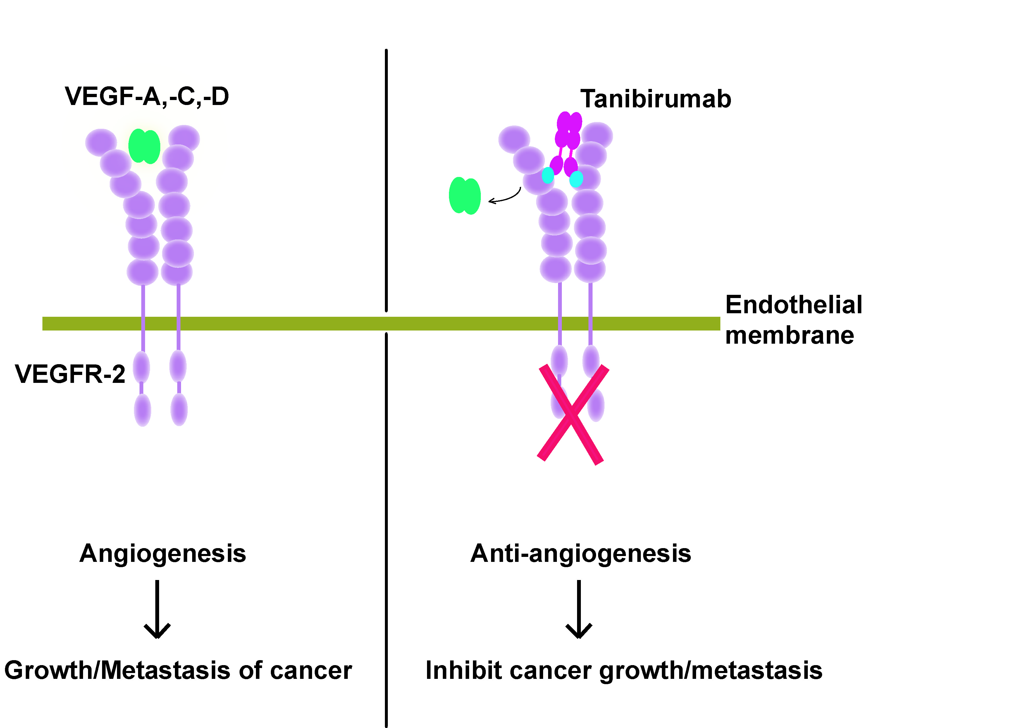 2008년 당시에 ㈜파멥신에서 개발 중이던 항체가 현재 호주에서 임상 2상을 진행 중에 있는 anti-VEGFR2 항체인 Tanibirumab이다. Tanibirumab이 targeting하는 VEGFR-2는 종양의 성장과 전이에 관여하는 신생혈관형성 인자 중 VEGF에 대한 수용체인데 VEGF/VEGFR-2 신호와 관련하여 이미 많은 의약품들이 시판되고 있고 또한 임상시험을 진행 중에 있다. 가장 대표적인 합성의약품으로는 Sutent가 있고, 항체 또는 단백질 의약품으로는 Avastin, Lucentis, Eylea, Cyramza가 있다. 이들 물질들은 종양이나 안과질환 등에 사용되고 있다. 특히 Cyramza는 Tanibirumab과 같은 VEGFR-2를 표적으로 하는 항체로 2014년 전이성 위암에 대하여 허가를 받았으나, Tanibirumab이 임상1상을 시작한 2011년경 에는 임상 2/3상을 수행하던 시기로 아직 허가를 받기 이전이었다. Tanibirumab가 가지고 있는 독특한 position은 이종간 교차반응을 보유하고 있는 것으로 이러한 특성을 이용한 translational research를 진행할 수 있다. 이러한 차별점은 Tanibirumab으로부터 혜택을 받을 수 있는 질환과 임상시험에 대한 설계를 도모할 수 있는 장점이 되며 또한 임상 성공률 제고 및 임상비용을 절약할 수도 있다.
