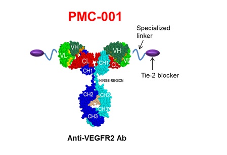 신생혈관형성에 관여하는 인자는 VEGF외에도 PlGF, Angiopoetin, PDGF, HGF, FGF, VE-cadherin등 많은 인자가 관여할 수 있다. 일반적으로 VEGF-A에 대한 항체인 Avastin을 treat하는 경우 초기에는 항암효과가 현저히 나타나다가 반복되는 treatment에 의하여 Avastin에 대하여 내성이 나타나는 것으로 알려져 있다. 이 경우에 종양은 VEGF-A외에 FGF등과 같은 다른 신생혈관형성 인자에 의해 유도될 수 있다. 이러한 아바스틴 내성에 대한 극복과 신생혈관형성 억제능을 향상 시키고자 ㈜파멥신에서는 VEGF/KDR 신호와 Angiopoietin-Tie2 신호를 동시에 억제할 수 있는 IgG format의 이중표적억제제를 개발하였다. Angiopoietin-2는 VEGF와 유사하게 신생혈관형성의 초기에 혈관세포의 migration등에 관여하는 것으로 알려져 있으며 현재 Amgen이나 Regeneron등에서 Angiopoietin-2를 표적으로 항암제 또는 안과질환 치료제로 개발하고 있다. Angiopoietin-1은 신생혈관의 형성의 마지막 단계인 Pericyte recruitment등과 같이 vessel stabilization 또는 vessel maturation에 관여하는 것으로 알려져 있다. 이들 Angiopoietin의 수용체가 Tie-2이며, Angiopoietin의 활성은 multimer 상태에서 최적의 활성을 나타낸다고 알려져 있다. PMC-001은 KDR(VEGFR-2)와 Tie-2에 결합하는 IgG format의 이중표적 항체이다.
