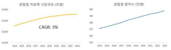 자가면역 질환의 한 가지인 관절염의 예에서도 환자수와 치료제 시장 규모가 점진적으로 증가하고 있다 (그림 1).
