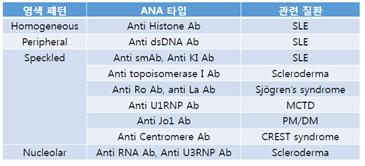 표1) ANA 종류 및 연관 질환