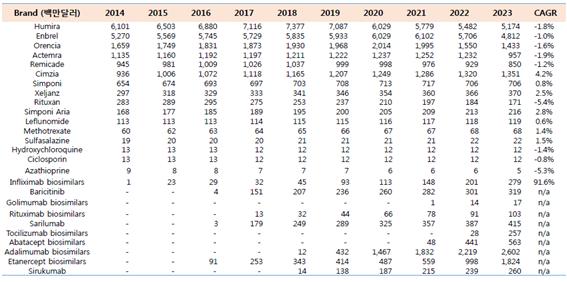 하지만, 최근 들어서 다양한 기전을 통한 항체 및 단백질 신약 (biologics), Xeljanz 및 다른 JAK inhibitor들과 같은 경구용 저분자 화합물 신약이 허가가 되었거나 임상 개발 단계에 있고 뒤 이어서 항체 신약에 대한 biosimilar 개발이 완료 되면서 속속 관절염 치료제 시장에 진입하고 있다. 특히, biosimilar의 경우에는 저분자화합물 generic drug과 달리 약가가 original drug의 60-70%를 받을 것으로 예상이 되기 때문에 많은 다국적 제약사와 삼성, 셀트리온에서도 진입을 하고 있고 그 경쟁으로 인해서 전체 시장규모는 성장을 하지만 개별 약품들의 성장은 정체 수준이거나 성장이 지지부진할 것으로 예상이 되고 있다 (표 2).
