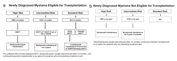 그림 1. Approach to the treatment of newly diagnosed myeloma in patients eligible for transplantation (A) and not eligible for transplantation (B). Abbreviation: ASCT, autologous stem cell transplantation; CR, complete response; DEX, dexamethasone; Rd, lenalidomide plus low-dose dexamethasone; VCD, bortezomib, cyclophosphamide, dexamethasone; VGPR, very good partial response; VRD, bortezomib, lenalidomide, dexamethasone
