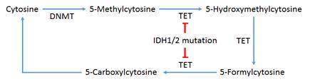 IDH는 isocitrate를 α-ketoglutarate로 변화시키는 효소이다. AML 환자의 5-10%와 10-15%에서, 각각 IDH1, IDH2 유전자 돌연변이가 발견된다. 변이된 IDH 효소는 α-ketoglutarate를 β-hydroxyglutarate 시켜 TET 작용을 억제하므로, hypermethylation을 유도한다. 돌연변이 IDH1 억제제로는 AG-120과 IDH305, IDH2 억제제로는 AG-221이 현재 초기 임상시험 중이며, AG-221은 76% 환자에서 효능이 있는 것으로 보고되었다.