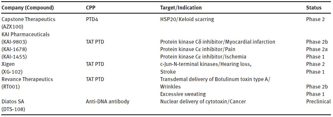 이렇게 오랜 기간동안 세포투과성 펩타이드에 대한 연구와 그 응용에 대한 연구가 이루어졌는데, 물론 세포투과성 펩타이드를 이용한 신약개발 노력으로서 TAT을 이용한 임상시험중인 약물들이 있다. 대표적인 약물로는 KAI-9803 (KAI Pharmaceuticals), KAI-1678 (KAI Pharmaceuticals), KAI-1455 (KAI Pharmaceuticals), XG-102 (Xigen) 등이 있으며 TAT의 아미노산 서열 변경을 통해 효율을 증가시킨 PTD4를 이용한 AZX100 (Capstone Therapeutics), R8 펩타이드를 이용한 Psorban (Cellgate) 등이 있다. KAI Pharmaceuticals의 pipeline은 Protein Kinase C 종류의 activator 혹은 inhibitor peptide 를 이용하여 심근경색 (KAI-9803, Phase II), 통증 (KAI-1678, Phase II), 국소빈혈 (KAI-1455, Phase I) 등을 치료하는 신약 후보물질들로 구성되어 있다. Xigen사의 XG-102는 JNK inhibiting peptide를 이용해 염증 (Phase III), 난청 (Phase II, III) 치료에 좋은 효과를 보이고 있으며 활발히 연구중에 있다. 반면, Capstone Therapeutics의 AZX100과 Cellgate의 Psorban은 임상 2상까지 진행되었으나 현재 개발이 중단된 상태이다.