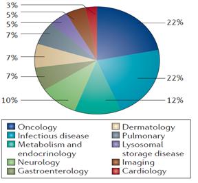 희귀질환에 대한 정의는 나라마다 조금씩 차이가 있으나 FDA는 환자 수 20만명 이하에 해당하는 질환의 치료제를 희귀의약품으로 정의하고 있다. 2011∼2013년 희귀질환 치료제 비중은 2011년 37% (11개), 2012년 33% (13개), 2013년 33% (9개)로 나타났으며 2014년의 경우에는 41% (17개)로 증가하였다. FDA는 2014년 승인된 희귀질환 치료제 중 바이오마린의 Vimizim (모르키오 A 증후군), 사노피아벤티스의 Cerdelga (고셔병), 얀센의 Sylvant (다발성 캐슬만씨병), 로슈의 Esbriet (특발성 폐 섬유증), 베링거인겔하임의 Ofev (특발성 폐 섬유증) 등을 주목할 만한 희귀질환 치료제로 제시한 바 있다. 한편, 세계보건기구(WHO)는 진단기술의 발달로 이전에 진단하지 못했던 희귀질환을 찾아내는 경우가 많아질 것으로 예상하고 있으며 제약기업들 입장에서도 희귀질환 치료제 개발이 상대적으로 낮은 승인장벽, 특허 독점기간과 개발비용에 대한 세제혜택 등에서 유리한 점이 존재하므로 희귀질환 치료제 개발은 앞으로 더욱 활발해질 것으로 예상된다.