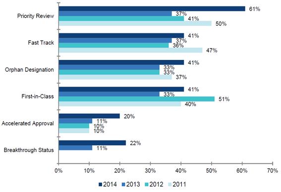 생물학적 제제 품목허가 (BLA, Biologics License Application) 승인 건수는 2014년 11건 (27%)으로 단 2건 승인에 그쳤던 2013년과 매해 6건의 BLA가 승인된 2009년∼2012년과 비교하여 증가한 승인 실적을 나타내었다.