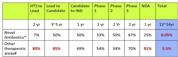 이러한 경향은 다른 질환분야와 항생제 분야의 각 단계별 성공률의 차이를 보면 항생제 discovery 및 개발의 어려움을 극명하게 보여준다. 아래 표에서 나타나는 것처럼 항생제 분야는 초기 Lead까지 성공률이 현저히 낮으며 전체적으로 성공률이 100배나 낮게 나타나고 있다.