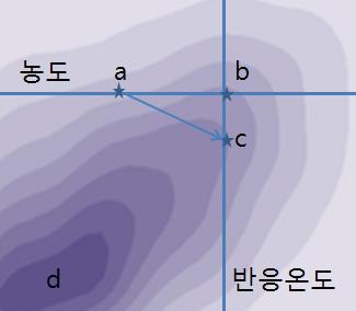 그림1에서 농도와 반응온도에 의해 수율이 변화되는 반응계를 보여주고 있다. 처음에 a에 위치하고 있고, 가장 수율이 높은 값을 가지는 d를 찾으려 한다고 가정해 보자. 우선 농도 (x축 변수)만을 변화시켜 보면, 가장 수율이 높은 값을 가지는 지점은 b가 된다. 이번에는 b 지점에서 농도를 고정하고 반응온도 (y축 변수)를 낮추어, 수율이 높아지는 반응조건을 찾으면 c가 된다. 다시 c지점에서 반응온도를 고정하고, 농도를 바꾸어 가면서 가장 수율이 높게 나오는 반응조건을 찾아 가야 한다. 여기서 반응에 대한 등고선 지도(Contour plot)가 있다면, 농도와 반응온도를 특정 비율로 동시에 변화시켜 d를 쉽게 찾을 수 있지만, 이것을 모르는 상황을 설정하고 설명하였다.