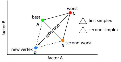 효과적으로 높은 반응값을 찾아 변수를 바꾸어 가는 방법으로 Simplex 실험법이 있다. 변수가 N개 있다고 가정하면, N+1개의 균형 있는 실험조건들을 적절히 잡아서 실험들을 실시 한다. 그 결과를 비교하고, 여기서 제일 나쁜 결과가 나오는 실험조건을 버리고, 그 대칭점을 찾아가는 방법이 Simplex 방법이다.8