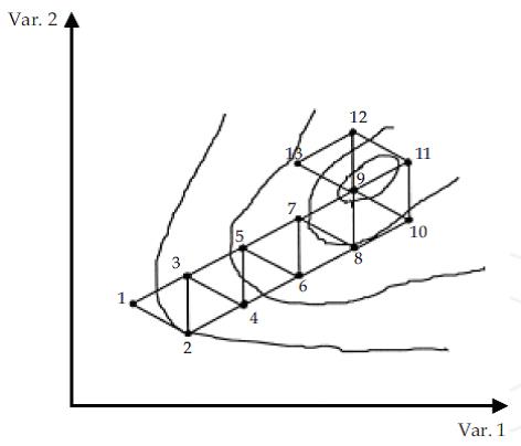 그림3에서 2개 변수를 가진 simplex의 최적화 예시를 보여준다. 1,2,3이 첫째 simplex이고, 처음 대칭점은 4가 되고, 다음 대칭점 5, 6, 7, 8, 9, 10, 11, 12, 13이 차례로 얻어진다. 이때 최적화된 곳의 대칭점들은 9번을 중심으로 회전하게 된다.