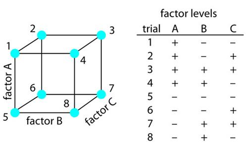 그림 4. 변수가 3개인 Factorial Design에서 실험 계획. 8 (=23)번의 실험을 필요로 한다.7